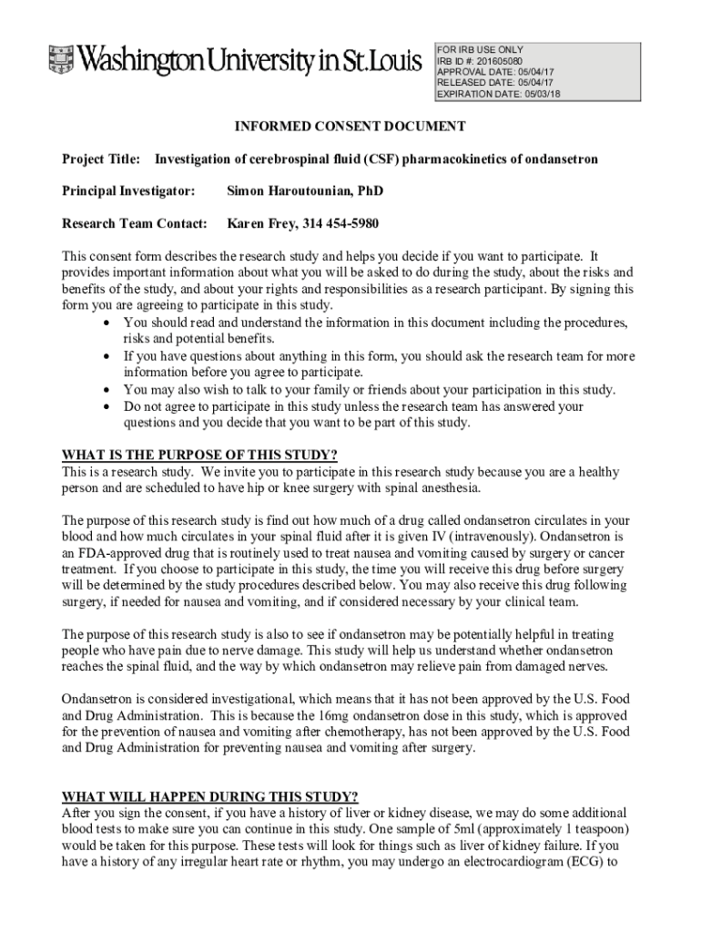 FOR IRB USE ONLY IRB ID #: 201605080 APPROVAL DATE: 05/04/17 RELEASED DATE: 05/04/17 EXPIRATION DATE: 05/03/18INFORMED CONSENT DOCUMENT Project Title:Investigation of cerebrospinal fluid (CSF) pharmacokinetics