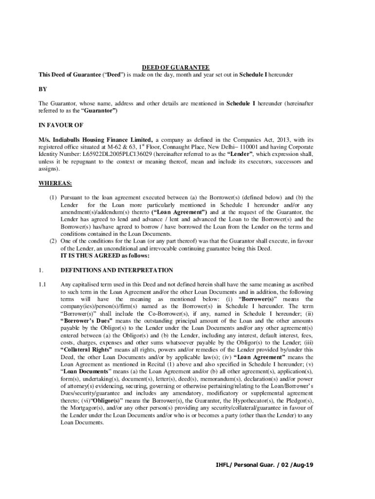 DEED OF GUARANTEE This Deed of Guarantee (Deed) is made on the day, month and year set out in Schedule I hereunder BY The Guarantor, whose name, address and other details are mentioned in Schedule