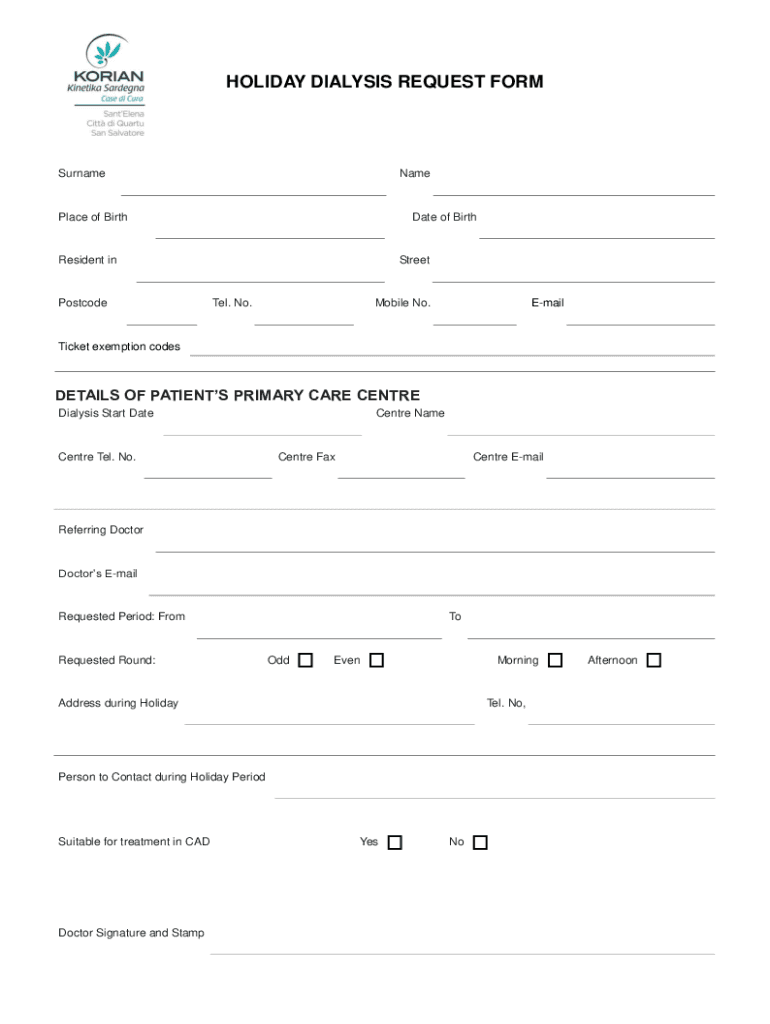 HOLIDAY DIALYSIS REQUEST FORMSurnameNamePlace of BirthDate of BirthResident inPostcodeStreetTel. No. Mobile No. EmailTicket exemption codesDETAILS OF PATIENTS PRIMARY CARE Center