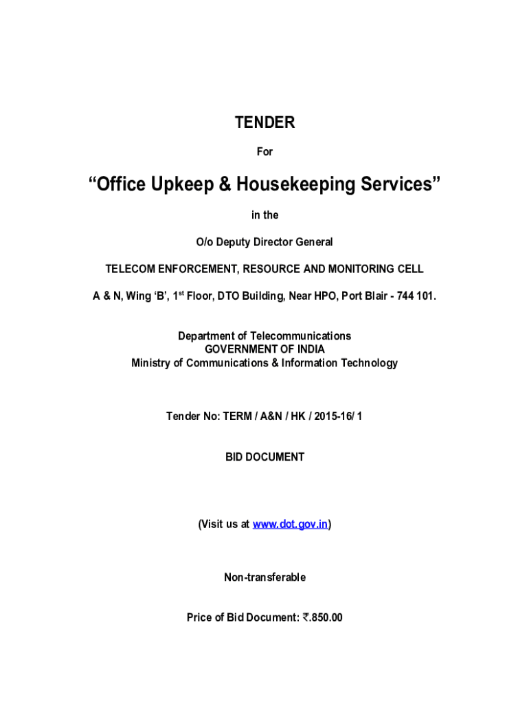 TENDER Office Upkeep & Housekeeping Services in the O/o Deputy Director General TELECOM ENFORCEMENT, RESOURCE AND MONITORING CELL A & N, Wing B, 1st Floor, TO Building, Near HBO, Port Blair 744 101.