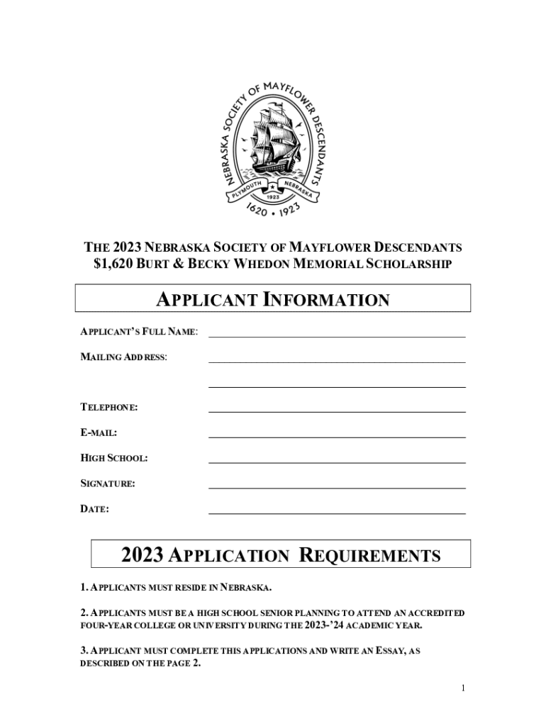 Individuals who wish to become members of the Nebraska Society of Mayflower and demonstrate direct descent from a Mayflower passenger are required to file an application.