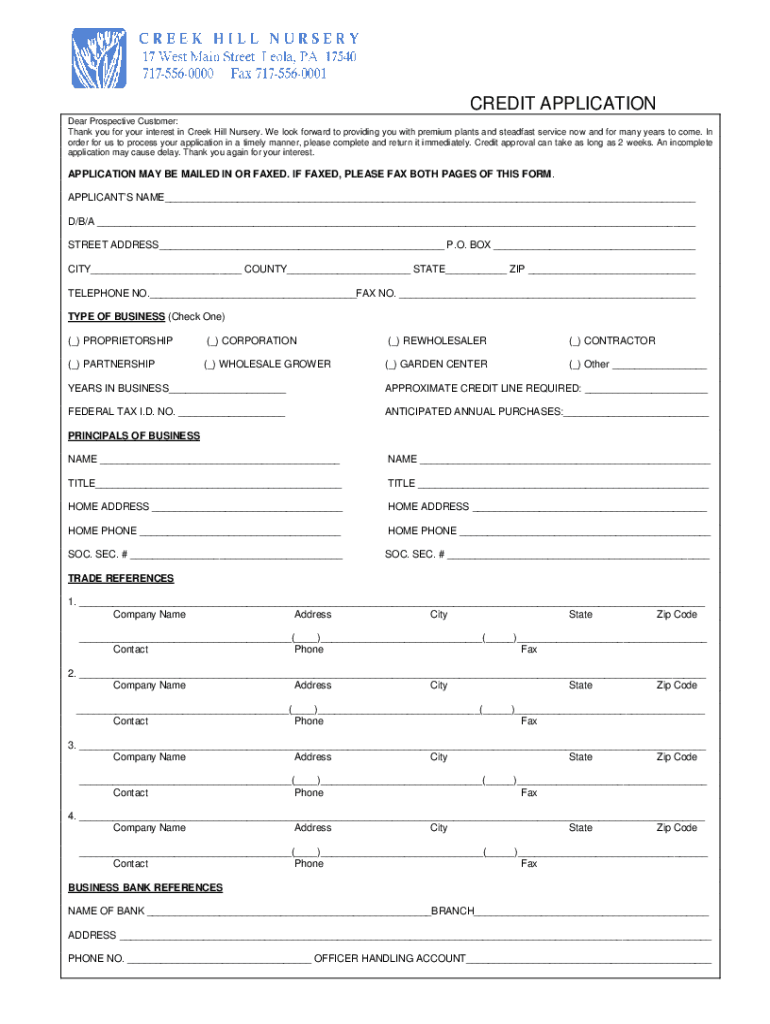 CREDIT APPLICATION Dear Prospective Customer: Thank you for your interest in Creek Hill Nursery. We look forward to providing you with premium plants and steadfast service now and for many years to
