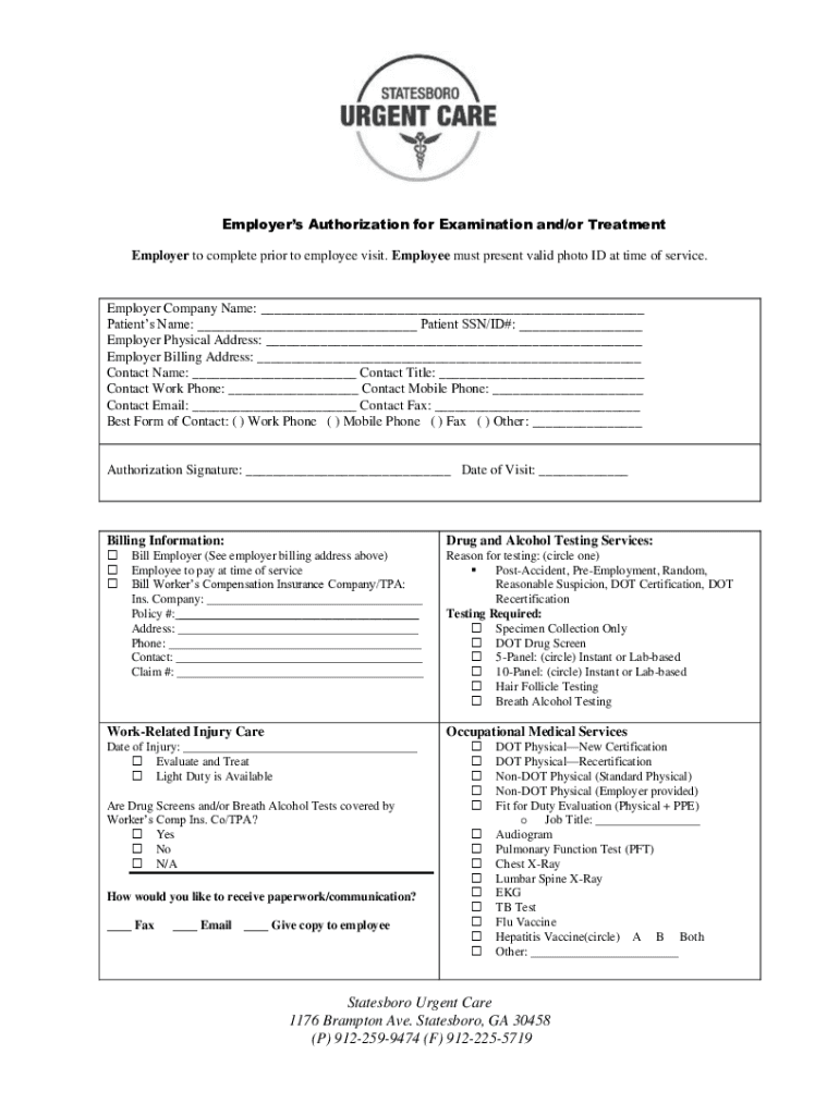 Employers Authorization for Examination and/or Treatment Employer to complete prior to employee visit. Employee must present valid photo ID at time of service. Employer Company Name: ___ Patients