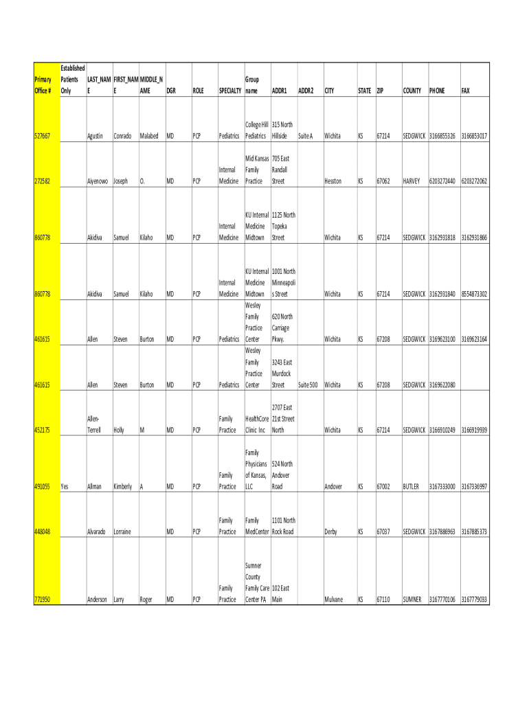 Primary Office #Established Patients LAST_NAM FIRST_NAM MIDDLE_N Only E AME DGR527667Agustin272582Aiyenowo860778Akidiva860778Akidiva461615Allen461615Allen452175AllenTerrell491055448048771950YesAllmanAlvaradoAndersonConradoJosephSamuelSamuelStevenStevenHollyKimberlyMalabedO.