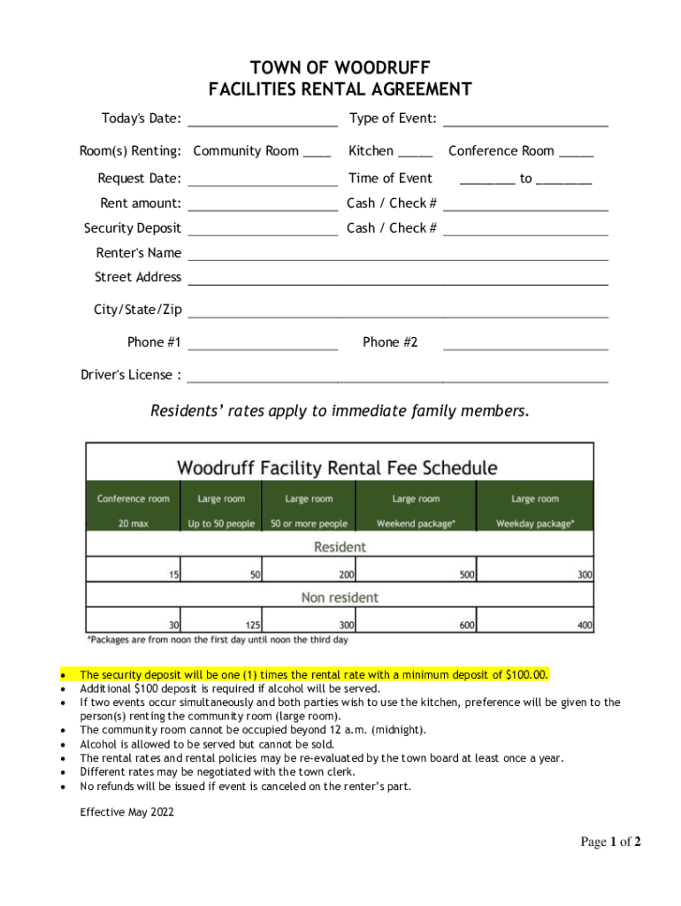 TOWN OF WOODRUFF FACILITIES RENTAL AGREEMENT Today\'s Date: Room(s) Renting: Community Room ___Type of Event: Kitchen ___Conference Room ___Request Date:Time of Event___ to ___Rent amount:Cash / Check