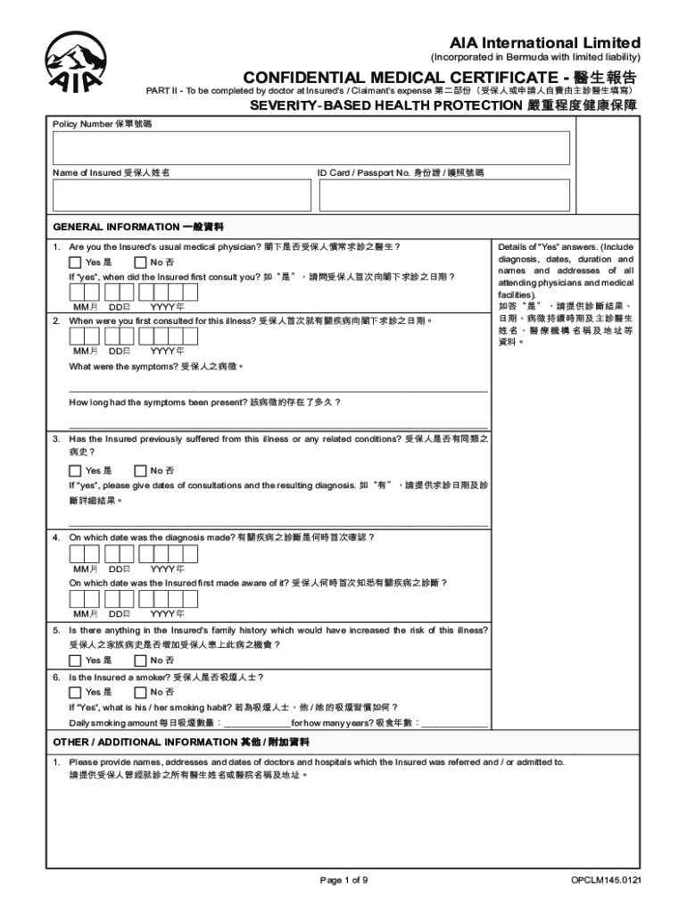 AIA International Limited(Incorporated in Bermuda with limited liability)CONFIDENTIAL MEDICAL CERTIFICATE PART II To be completed by doctor at Insureds / Claimants expense SEVERITYBASED HEALTH PROTECTION