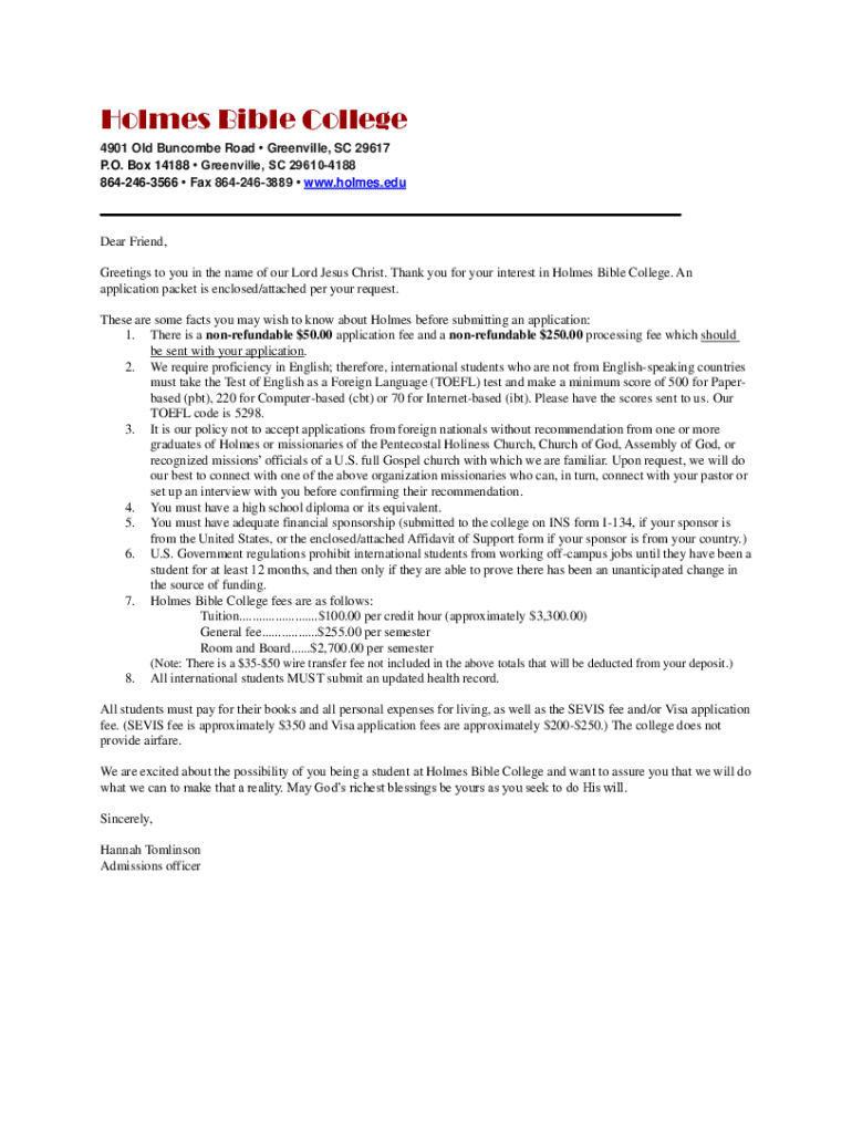 Holmes Bible College 4901 Old Buncombe Road Greenville, SC 29617 P.O. Box 14188 Greenville, SC 296104188 8642463566 Fax 8642463889 www.holmes.edu___ Dear Friend, Greetings to you in the name of our