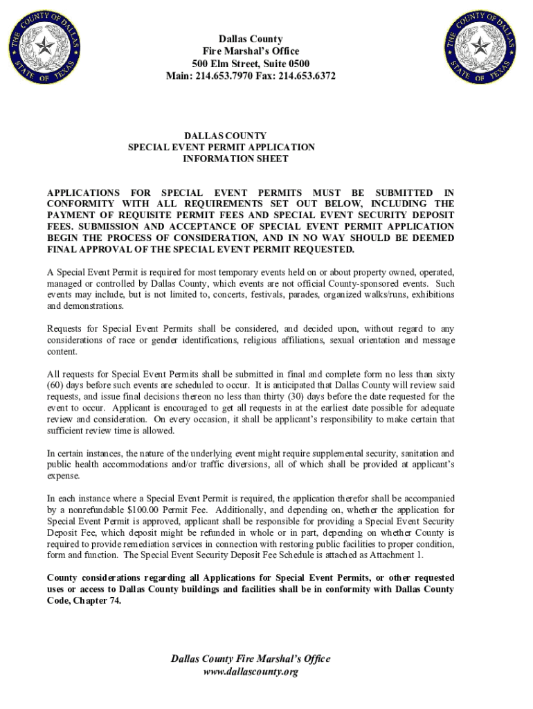 Dallas County Fire Marshals Office 500 Elm Street, Suite 0500 Main: 214.653.7970 Fax: 214.653.6372DALLAS COUNTY SPECIAL EVENT PERMIT APPLICATION INFORMATION SHEET APPLICATIONS FOR SPECIAL EVENT PERMITS