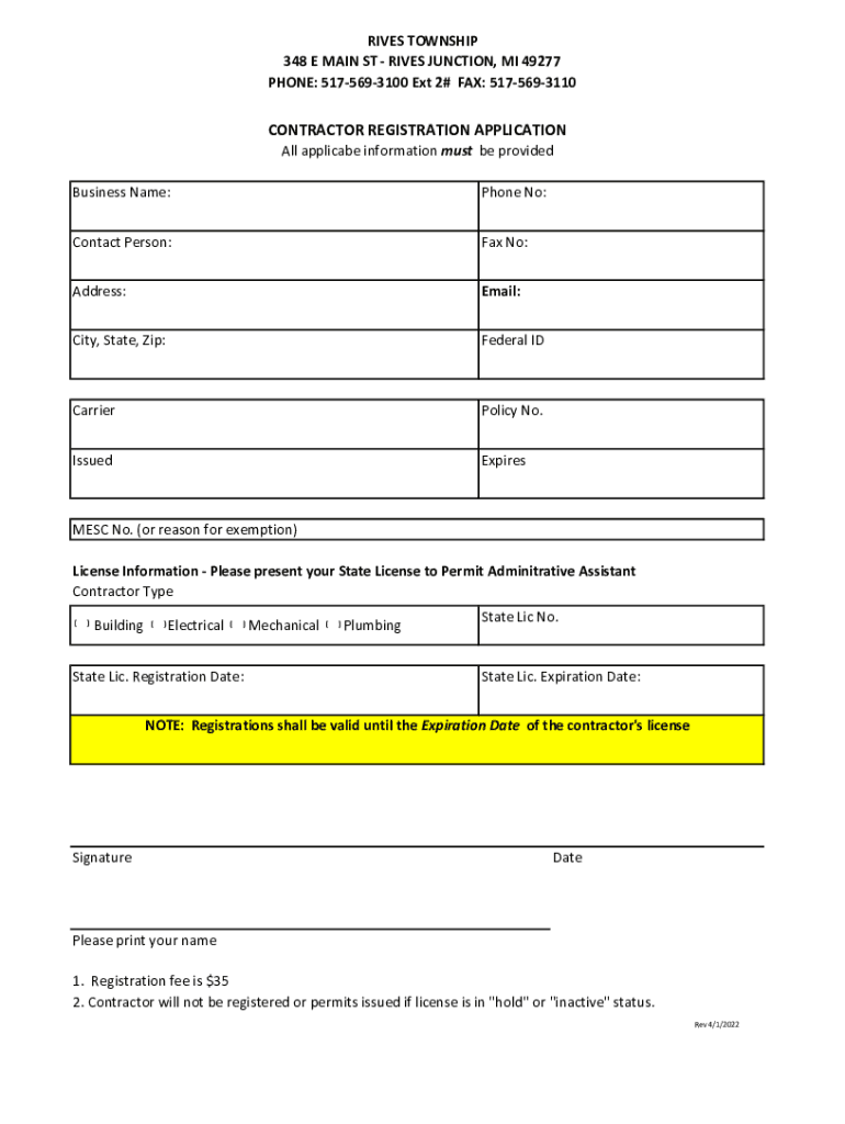 RIVES TOWNSHIP 348 E MAIN ST RIVES JUNCTION, MI 49277 PHONE: 5175693100 Ext 2# FAX: 5175693110CONTRACTOR REGISTRATION APPLICATION All applicable information must be provided Business Name:Phone No:Contact