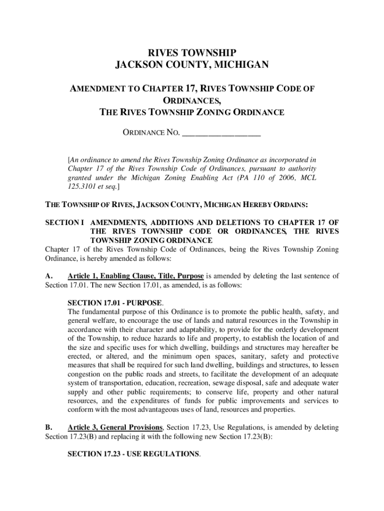 RIVES TOWNSHIP JACKSON COUNTY, MICHIGAN AMENDMENT TO CHAPTER 17, RIVES TOWNSHIP CODE OF ORDINANCES, THE RIVES TOWNSHIP ZONING ORDINANCE NO. ___ [An ordinance to amend the Rives Township Zoning Ordinance