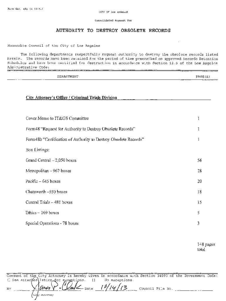 Form Gen.48a(R 1081) CITY LOS ANGELESConsolidatedAUTHORITY HonorableRequestTO DESTROYForOBSOLETERECORDSCouncil of the City of Los Angeles following departments respectfully request authority to destroy