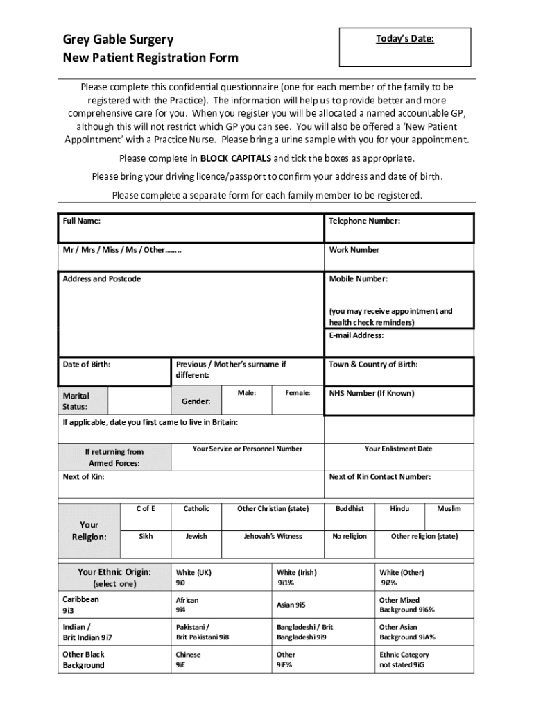 Grey Gable Surgery New Patient Registration FormTodays Date:Please complete this confidential questionnaire (one for each member of the family to be registered with the Practice). The information