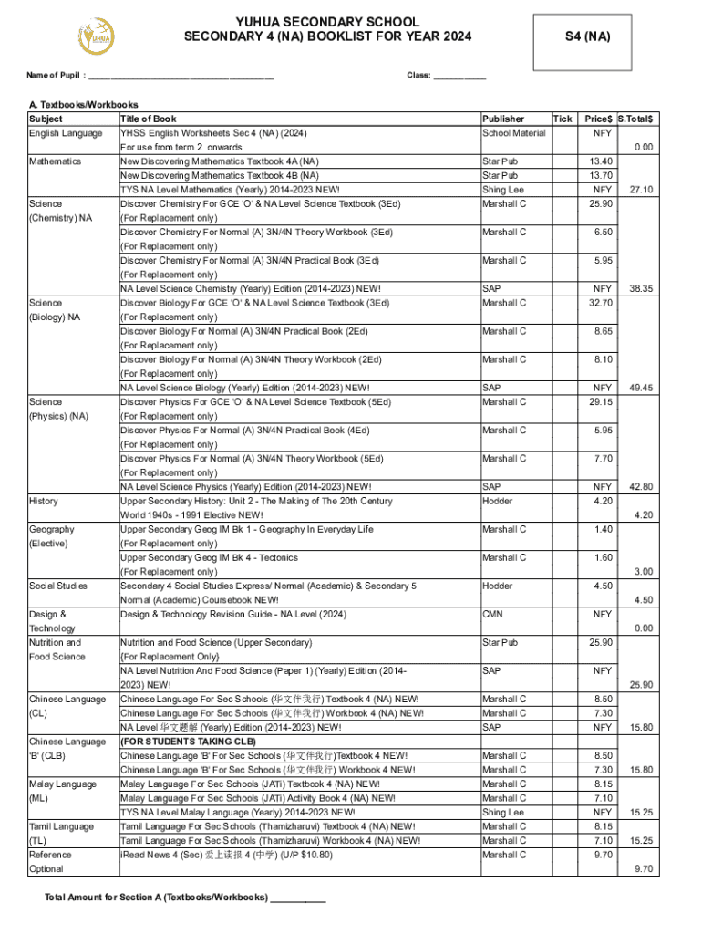 YUMA SECONDARY SCHOOL SECONDARY 4 (NA) BOOKLET FOR YEAR 2024 Name of Pupil : ___Class: ___A. Textbooks/Workbooks Subject Title of Book English Language HSS English Worksheets Sec 4 (NA) (2024) For