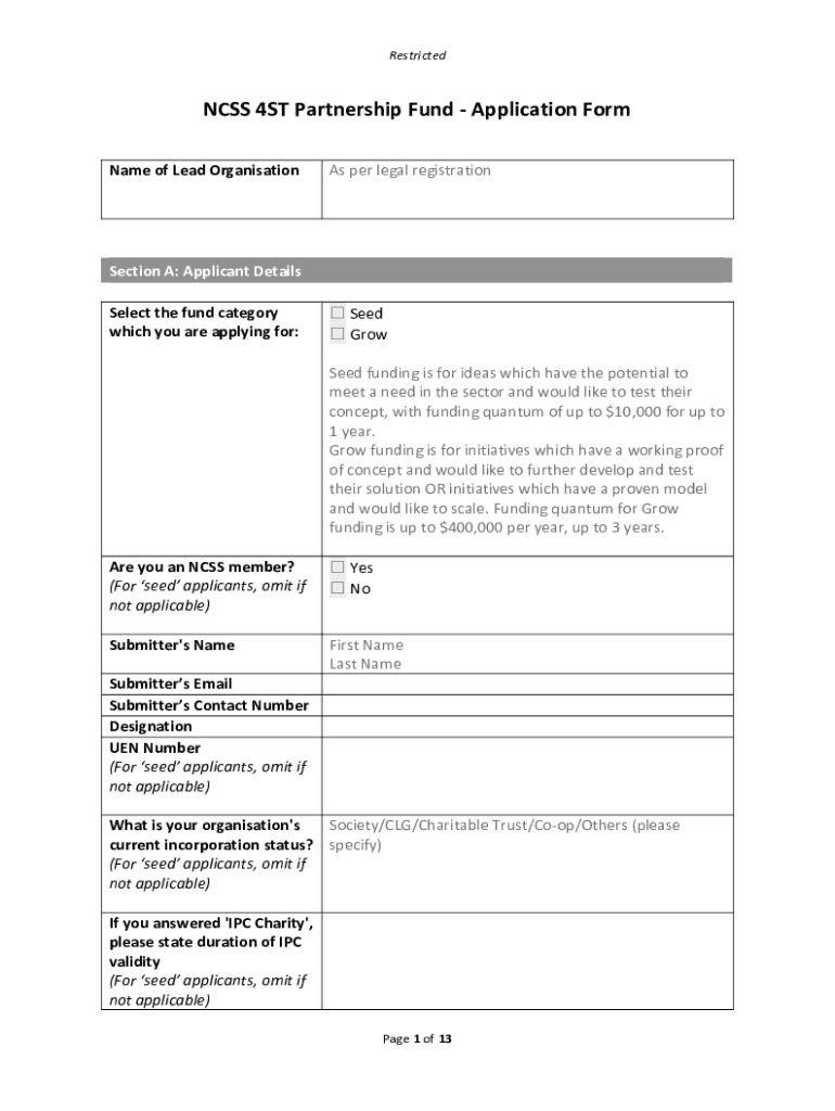 RestrictedNCSS 4ST Partnership Fund Application Form Name of Lead OrganisationAs per legal registrationSection A: Applicant Details Select the fund category which you are applying for: Seed Grow Seed