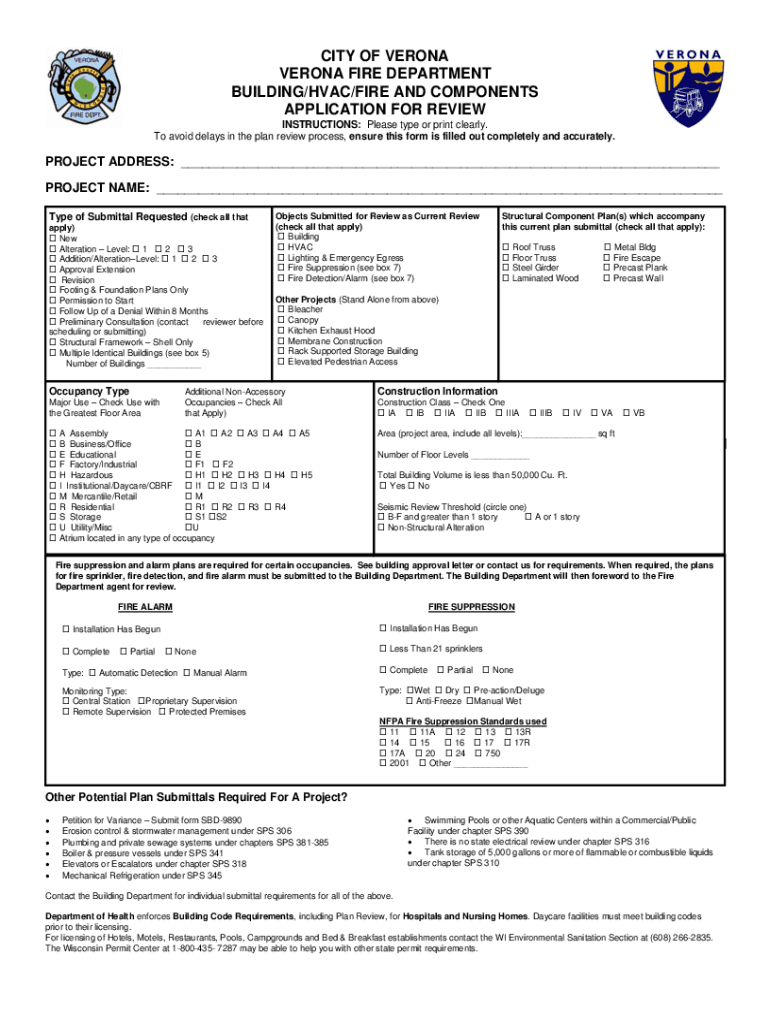 CITY OF VERONA VERONA FIRE DEPARTMENT BUILDING/HVAC/FIRE AND COMPONENTS APPLICATION FOR REVIEW INSTRUCTIONS: Please type or print clearly. To avoid delays in the plan review process, ensure this form