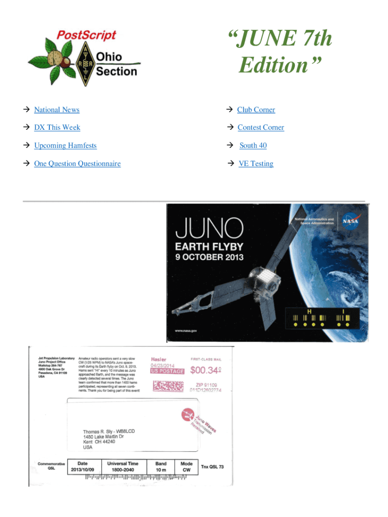 JUNE 7th Edition National News Club Corner DX This Week Contest Corner Upcoming Ham fests South 40 One Question Questionnaire VE TestingNational News (from ARL and other sources)ARL Learning Network