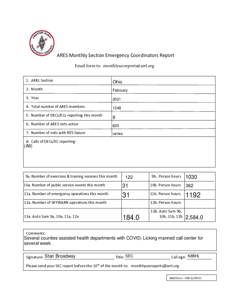 ARES Monthly Section Emergency Coordinators Report Email form to: monthlysecreports@arrl.org 1. ARL SectionOhio2. MonthFebruary3. Year20214. Total number of ARES members12485. Number of DECs/ECS reporting