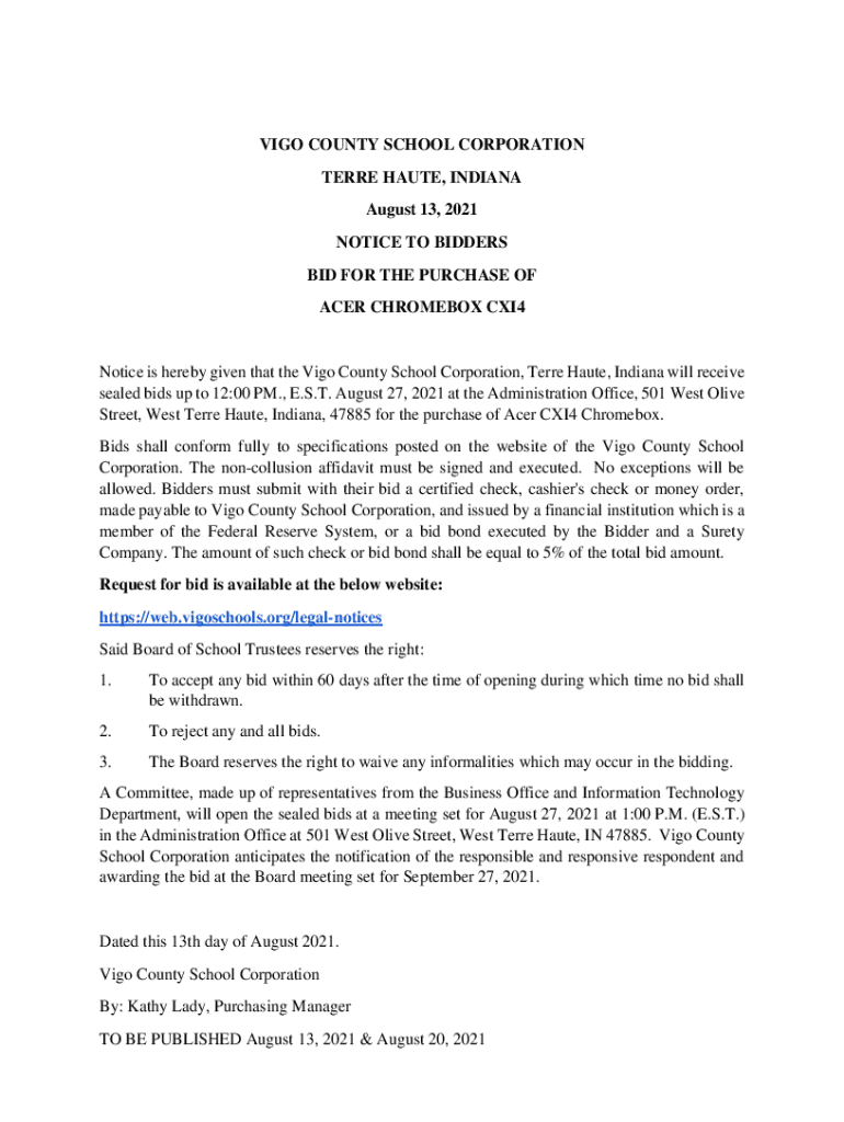 VIGO COUNTY SCHOOL CORPORATION TERRE HAUTE, INDIANA August 13, 2021, NOTICE TO BIDDERS BID FOR THE PURCHASE OF ACER CHROME BOX CXI4Notice is hereby given that the Vigo County School Corporation, Terre