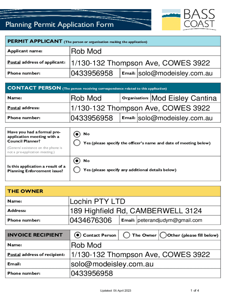 Planning Permit Application Form Employee Commencement Form employee commencement form PERMIT APPLICANT (The person or organization making the application) Applicant name:Rob Postal address of applicant:1/130132