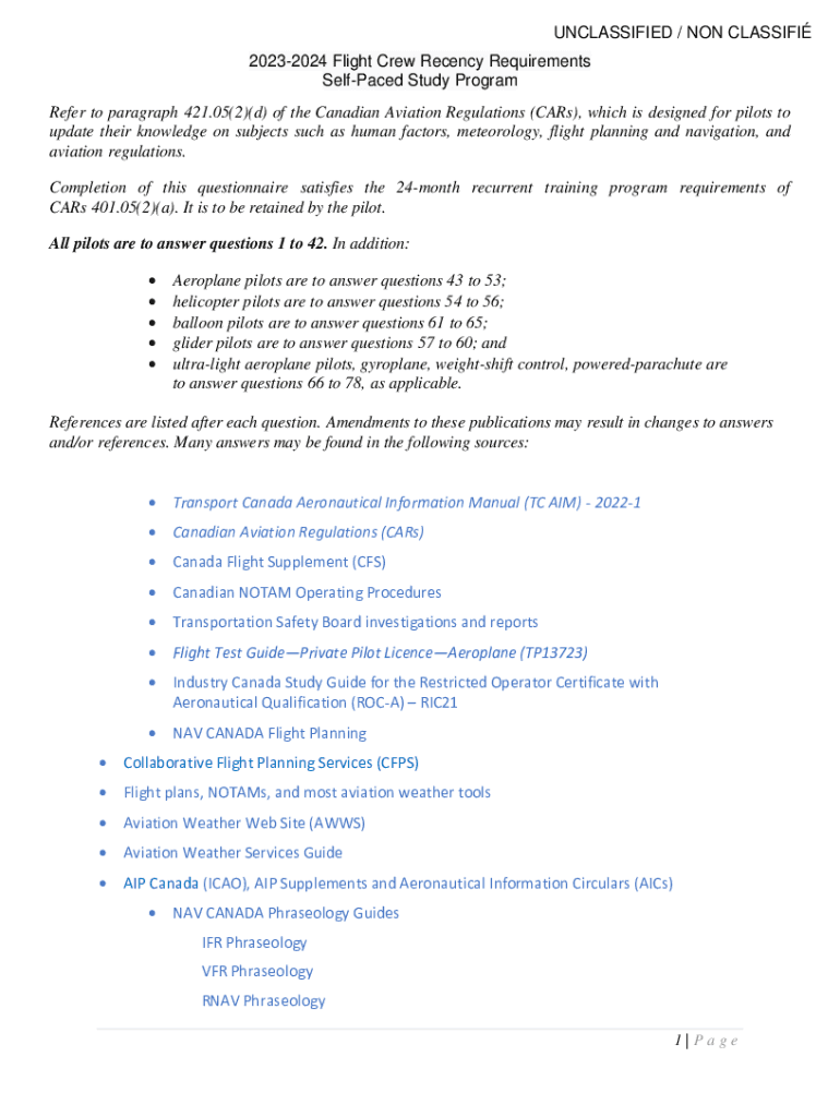 UNCLASSIFIED / NON CLASSIFY 20232024 Flight Crew Recency Requirements Self-paced Study Program Refer to paragraph 421.05(2)(d) of the Canadian Aviation Regulations (Cars), which is designed for pilots