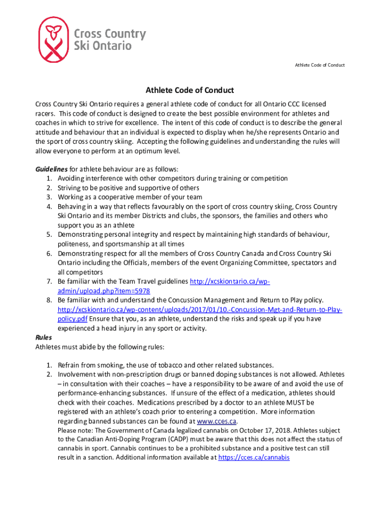 Athlete Code of ConductAthlete Code of Conduct Cross Country Ski Ontario requires a general athlete code of conduct for all Ontario CCC licensed racers. This code of conduct is designed to create
