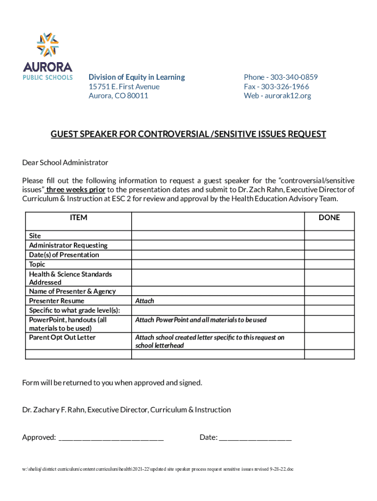 Division of Equity in Learning 15751 E. First Avenue Aurora, CO 80011Phone 3033400859 Fax 3033261966 Web aurorak12.biggest SPEAKER FOR CONTROVERSIAL /SENSITIVE ISSUES REQUEST Dear School Administrator