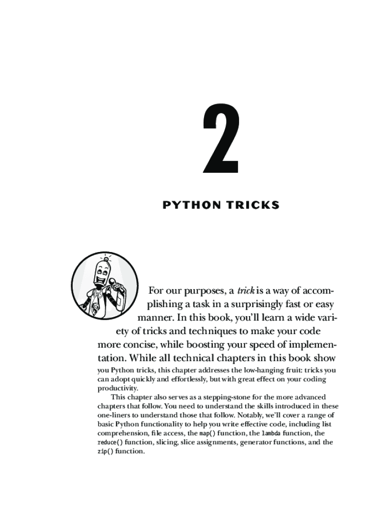 2PY THEN Trickster our purposes, a trick is a way of accomplishing a task in a surprisingly fast or easy manner. In this book, you'll learn a wide variety of tricks and techniques to make your code
