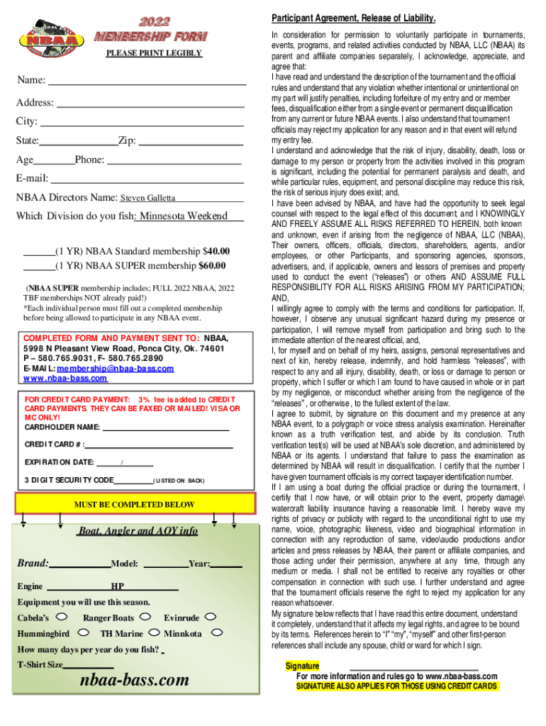 2022 MEMBERSHIP FORM PLEASE PRINT LEGIBLYName: Address: City: State:Zip:Phone:Email: NCAA Directors Name: Steven Valletta Which Division do you fish: Minnesota Weekend (1 YR) NCAA Standard membership