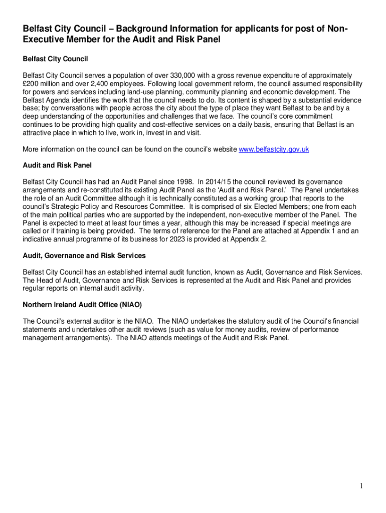 Belfast City Council Background Information for applicants for post of Consecutive Member for the Audit and Risk Panel Belfast City Council Belfast City Council serves a population of over 330,000
