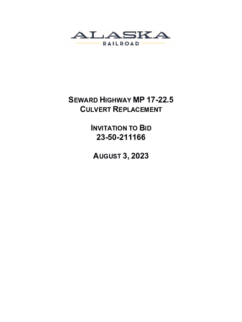SEWARD HIGHWAY MP 1722.5 CULVERT REPLACEMENT INVITATION TO BID 2350211166 AUGUST 3, 2023ALASKA RAILROAD CORPORATION 327 W. SHIP CREEK AVENUE ANCHORAGE, AK 99501 PHONE 907.265.2355 CELL 907.854.3141