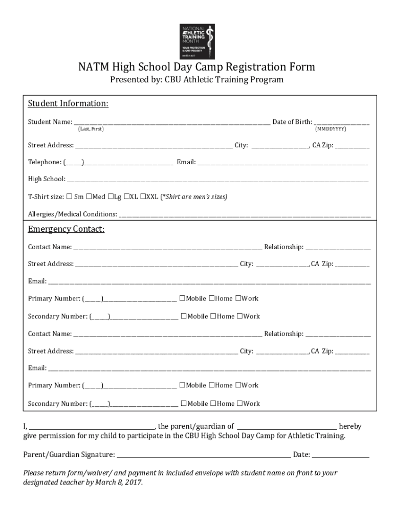 NATM High School Day Camp Registration FormPresented by: CBU Athletic Training ProgramStudent Information:Student Name: ___ Date of Birth: ___(Last, First)(MMDDYYYY)Street Address: ___ City:___, CA