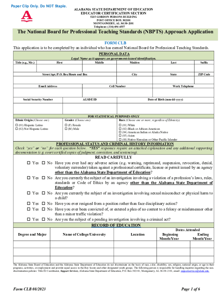 Paper Clip Only. Do NOT Staple. ALABAMA STATE DEPARTMENT OF EDUCATIONEDUCATOR CERTIFICATION SECTION