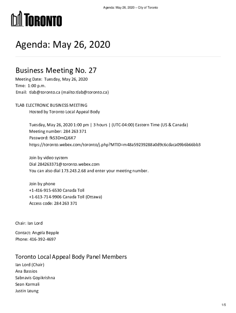 Agenda: May 26, 2020, City of TorontoAgenda: May 26, 2020, Business Meeting No. 27 Meeting Date: Tuesday, May 26, 2020, Time: 1:00 p.m. Email: tlab@toronto.ca (mail to:tlab@toronto.ca) LAB ELECTRONIC