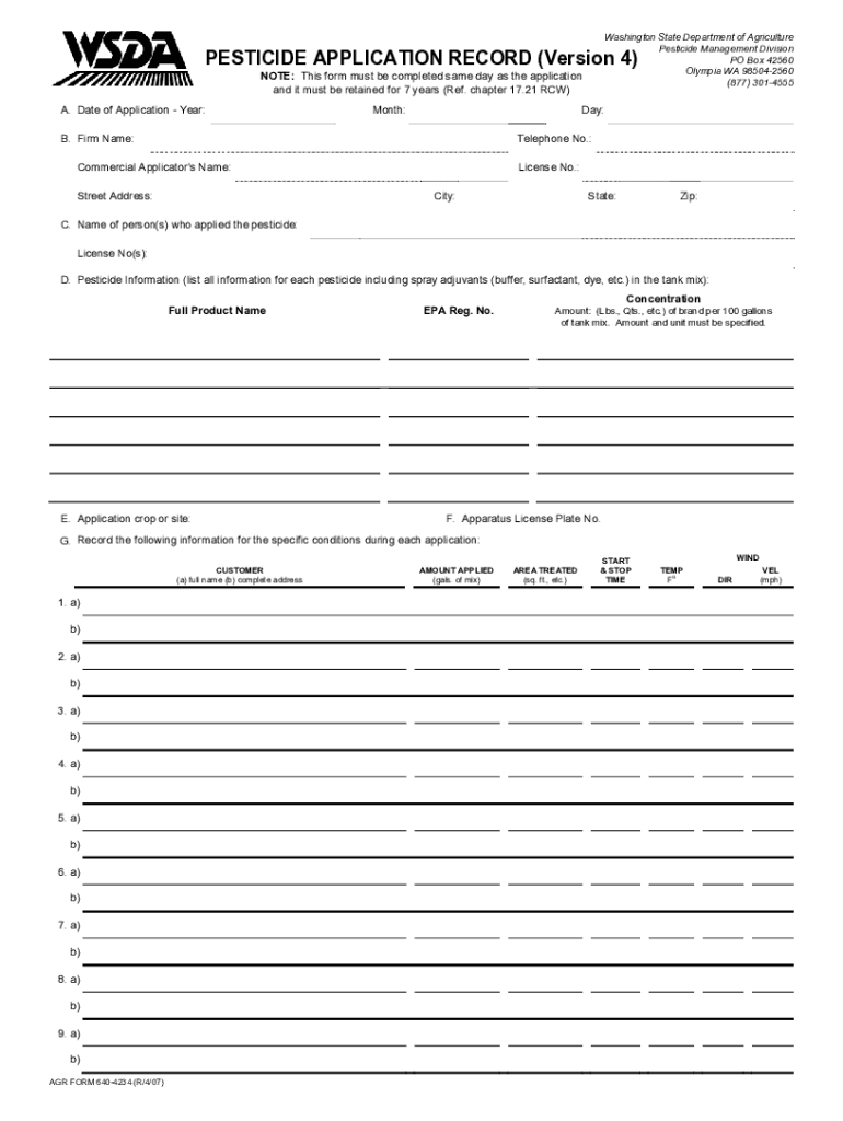 Washington State Department of Agriculture Pesticide Management Division PO Box 42560 Olympia WA 985042560 (877) 3014555PESTICIDE APPLICATION RECORD (Version 4) NOTE: This form must be completed same