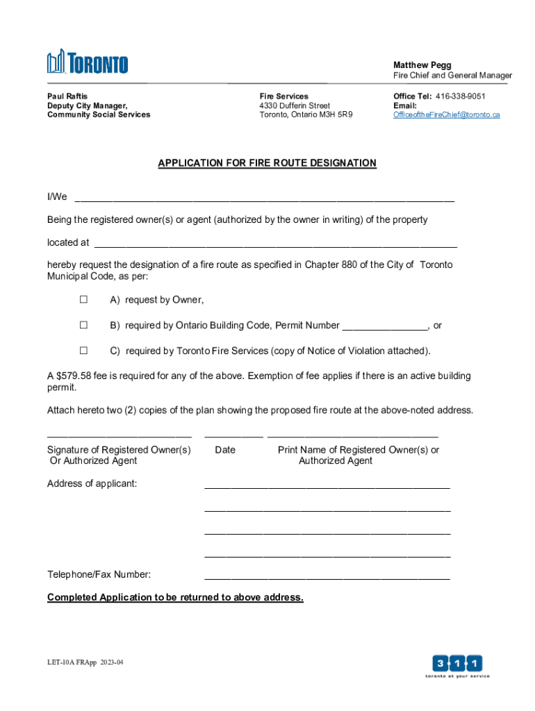 Matthew Egg Fire Chief and General Manager, Paul Rafts Deputy City Manager, Community Social ServicesFire Services 4330 Duffer in Street Toronto, Ontario M3H 5R9Office Tel: 4163389051 Email: OfficeoftheFireChief@toronto.caAPPLICATION