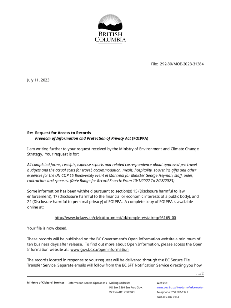 File: 29230/MOE202331384July 11, 2023Re: Request for Access to Records Freedom of Information and Protection of Privacy Act (FOIPPA) I am writing further to your request received by the Ministry of