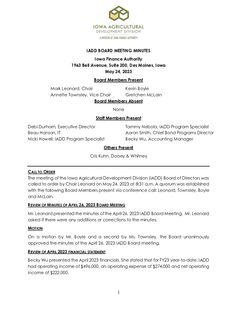 IADD BOARD MEETING MINUTES Iowa Finance Authority 1963 Bell Avenue, Suite 200, Des Moines, Iowa May 24, 2023 Board Members Present Mark Leonard, Chair Kevin Boyle Annette Townsley, Vice Chair Gretchen