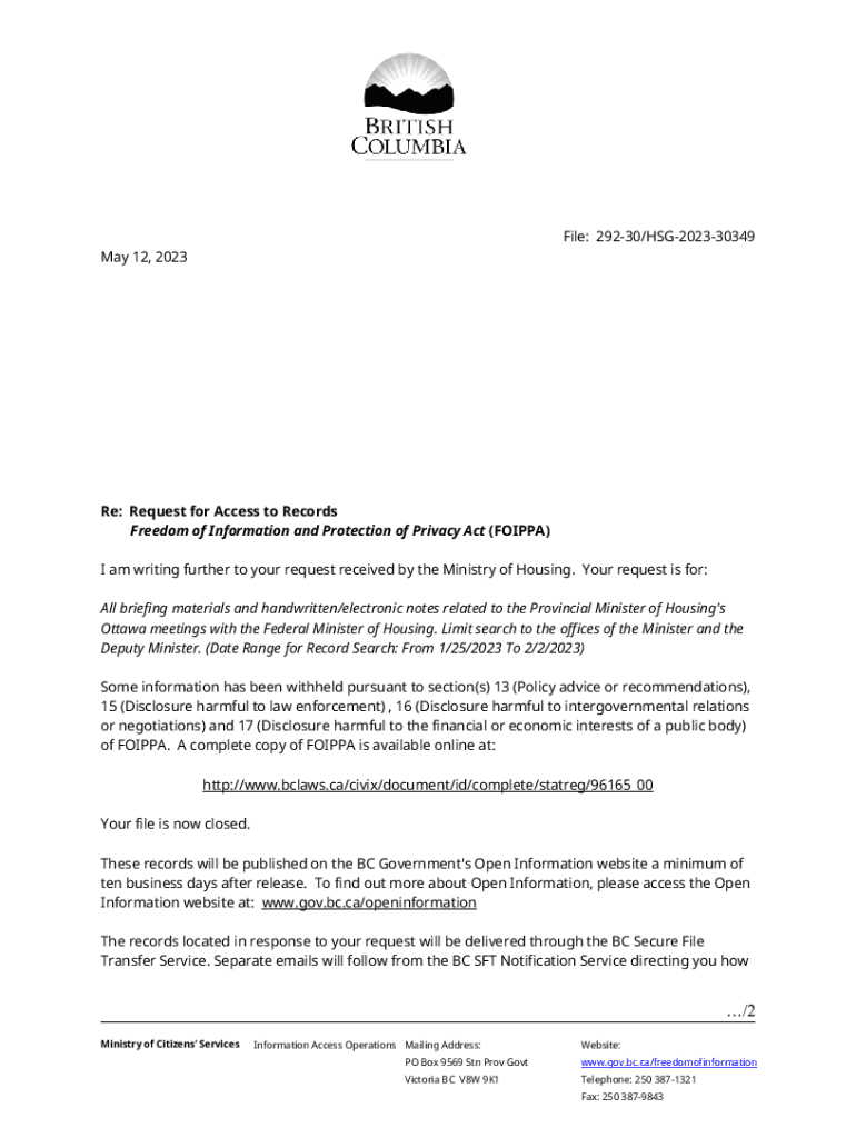 File: 29230/HSG202330349May 12, 2023Re: Request for Access to Records Freedom of Information and Protection of Privacy Act (POPPA) I am writing further to your request received by the Ministry of