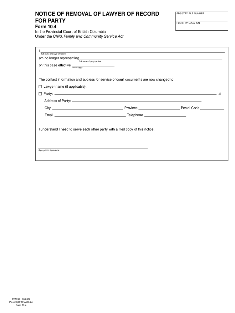 Get the free Notice of Removal of Lawyer of Record for Party Form 10.4. pfa708.pdf, notice, remov...