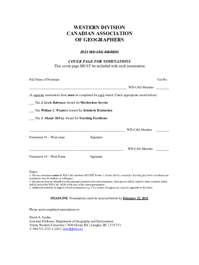 WESTERN DIVISION CANADIAN ASSOCIATION OF GEOGRAPHERS 2021 WD CAG AWARDS COVER PAGE FOR NOMINATIONS This cover page MUST be included with each nomination Full Name of Nominee:Yes/No___ WD CAG Member