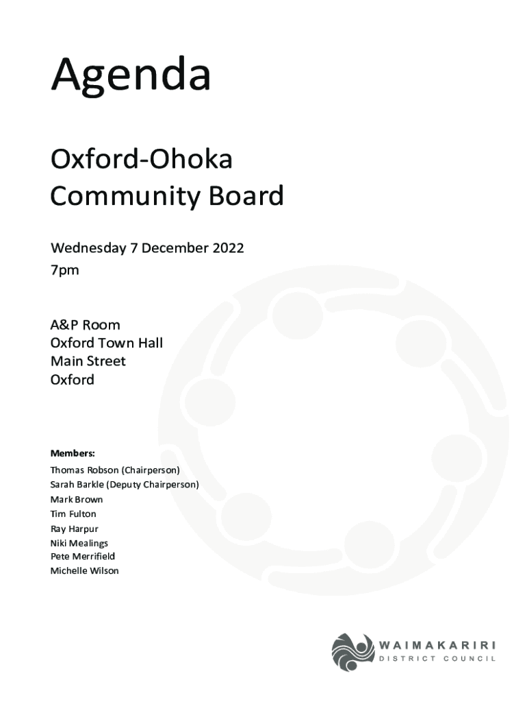 Agenda OxfordOhoka Community Board Wednesday 7 December 2022 7pm A&P Room Oxford Town Hall Main Street OxfordMembers: Thomas Robson (Chairperson) Sarah Barkle (Deputy Chairperson) Mark Brown Tim Fulton