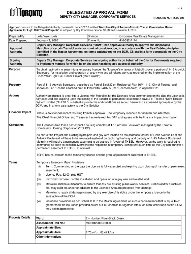 1 of 4DELEGATED APPROVAL FORM DEPUTY CITY MANAGER, CORPORATE SERVICESTRACKING NO.: 2020028Approved pursuant to the Delegated Authority contained in Item CC27.6 entitled MetrolinxCity of TorontoToronto