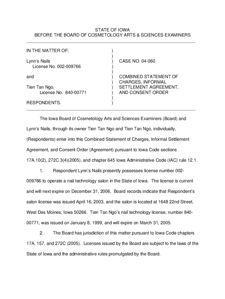 STATE OF IOWA BEFORE THE BOARD OF COSMETOLOGY ARTS & SCIENCES EXAMINERS ___ IN THE MATTER OF:) ) Lynns Nails ) CASE NO. 04060 License No. 002009766 ) ) and ) COMBINED STATEMENT OF ) CHARGES, INFORMAL