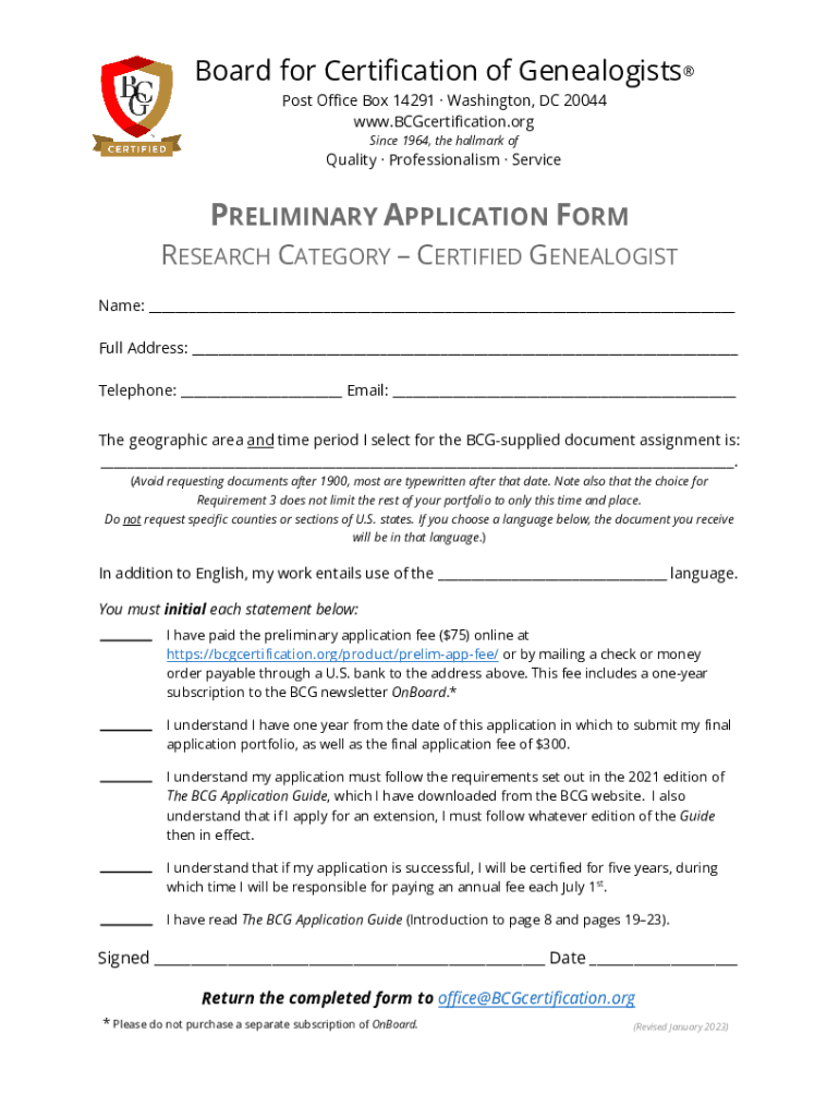 Board for Certification of Genealogists Post Office Box 14291 Washington, DC 20044 www.BCGcertification.org Since 1964, the hallmark ofQuality Professionalism ServicePRELIMINARY APPLICATION FORM RESEARCH