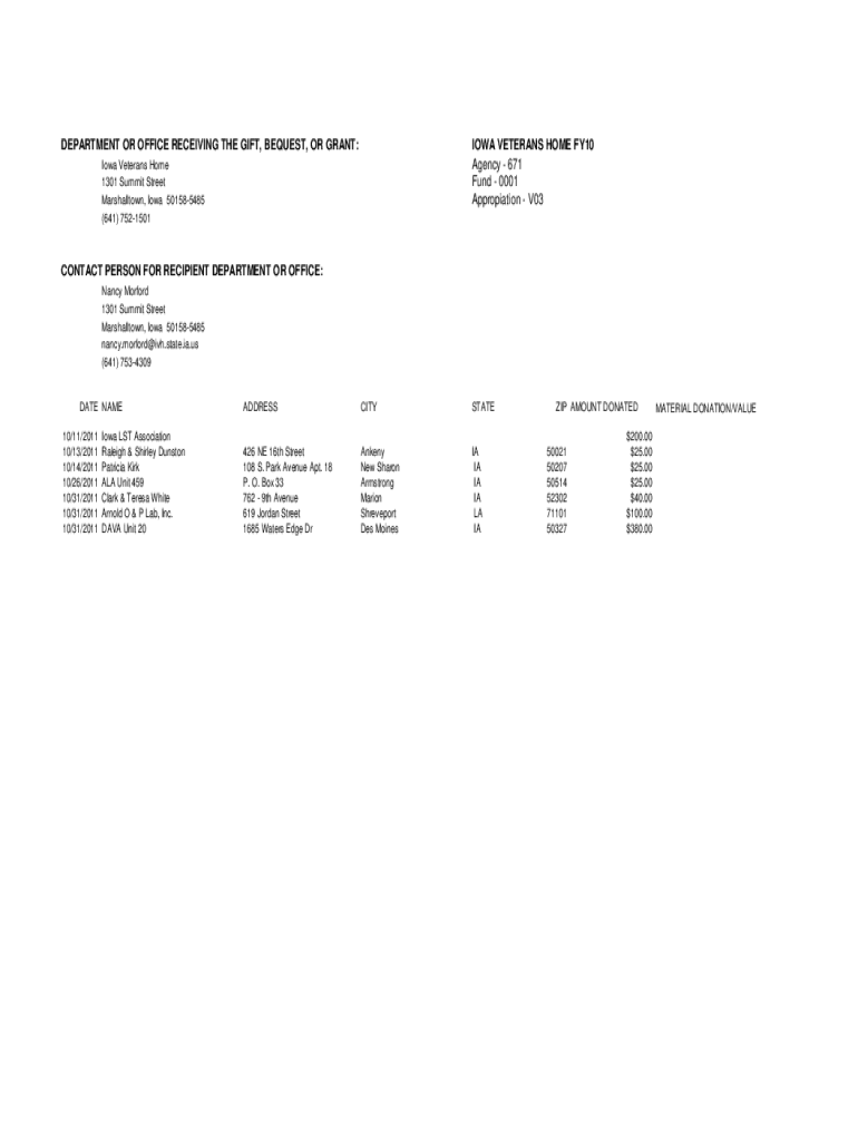 DEPARTMENT OR OFFICE RECEIVING THE GIFT, BEQUEST, OR GRANT:IOWA VETERANS HOME FY10 Agency 671 Fund 0001 Appropriation V03Iowa Veterans Home 1301 Summit Street Marshalltown, Iowa 501585485 (641) 7521501CONTACT
