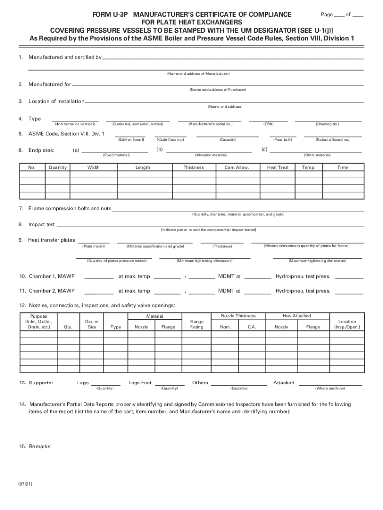 Page of FORM U3P MANUFACTURERS CERTIFICATE OF COMPLIANCE FOR PLATE HEAT EXCHANGERS COVERING PRESSURE VESSELS TO BE STAMPED WITH THE UM DESIGNATOR [SEE U1(j)] As Required by the Provisions of the ASHE