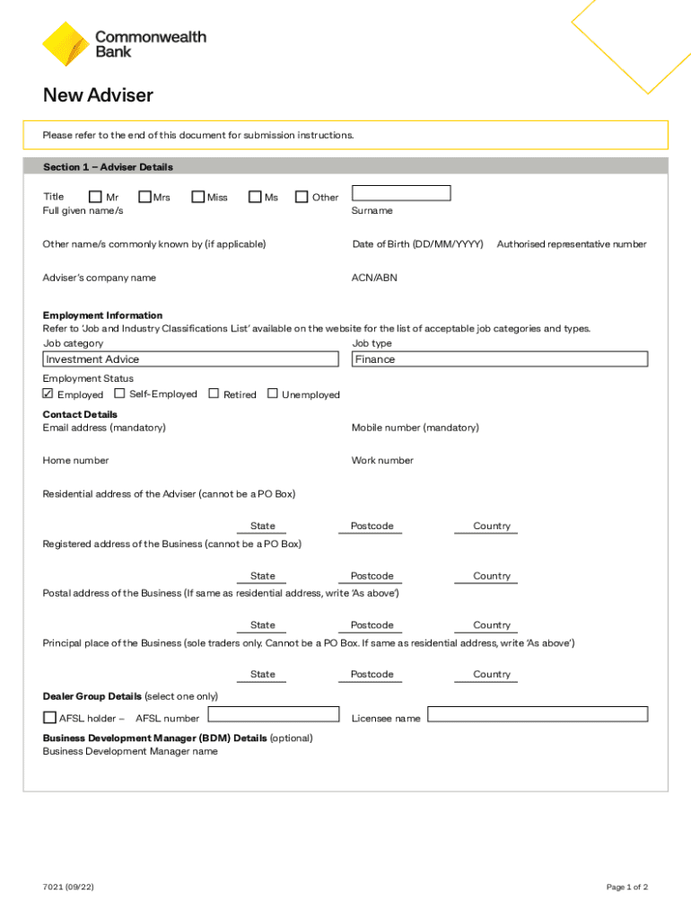 New Adviser Please refer to the end of this document for submission instructions. Section 1 Adviser Details Title Mr Full given name/sMrsMissMsOther SurnameOther name/s commonly known by (if applicable)Date