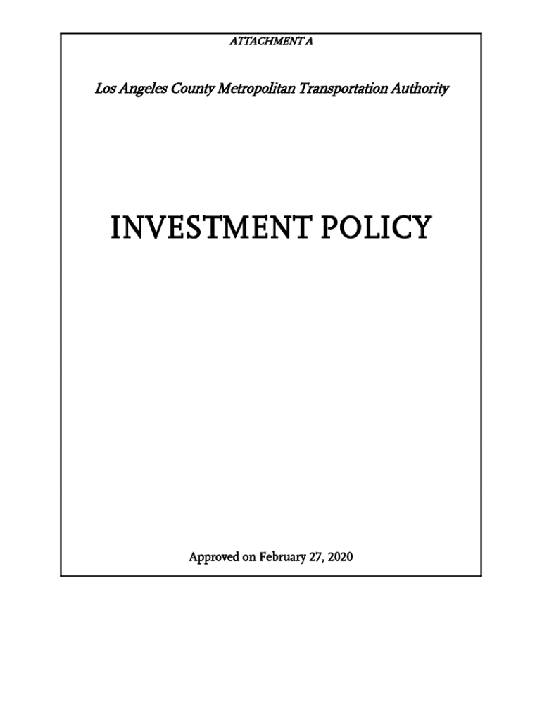 ATTACHMENT Also Angeles County Metropolitan Transportation AuthorityINVESTMENT POLICYApproved on February 27, 2020INVESTMENT POLICY