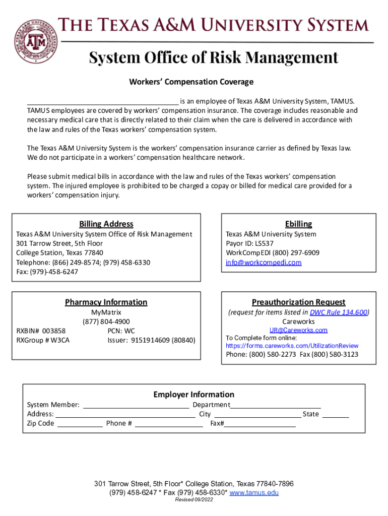 Workers Compensation Coverage ___ is an employee of Texas A&M University System, CAMUS. CAMUS employees are covered by workers' compensation insurance. The coverage includes reasonable and necessary