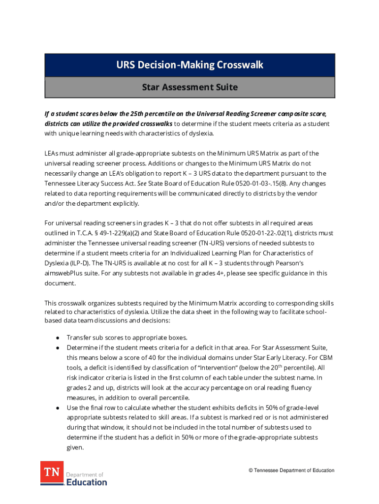 URS Decision-making Crosswalk Star Assessment Suite If a student scores below the 25th percentile on the Universal Reading Screener composite score, districts can utilize the provided crosswalks to